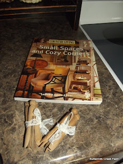 The "Small Spaces and Cozy Corners" is full of fun, decorating ideas and perfect for me as I have lots of small corners...ha! And the vintage clothespins....well they started in the US, made their way to Belgium and are now back in the U.S. And Goedele tells me that they were used by the Amish. How awesome!!! I just so happen to have the perfect little spot to display them.